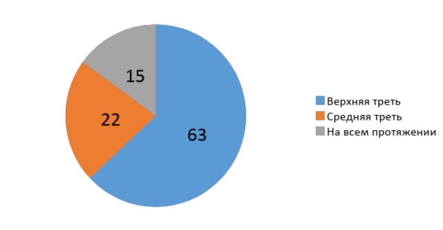 Также у всех пациентов выявили утолщение грудинноключичнососцевидной (ГКС) мышцы: в верхней трети у 63%, средней трети у 22%, на всем протяжении у 15% (График 1).