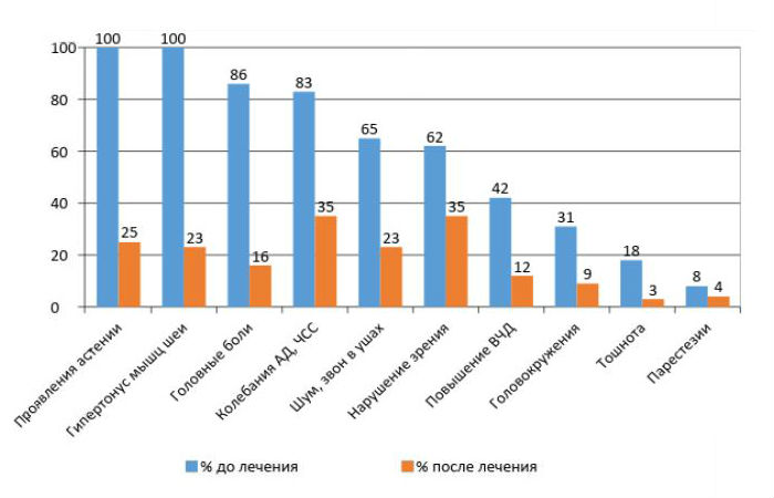 Частота проявлений астении и ощущения зажатости в области шейно-воротниковой зоны, имевшие место у всех пациентов, снизились на 75 и 77% соответственно.